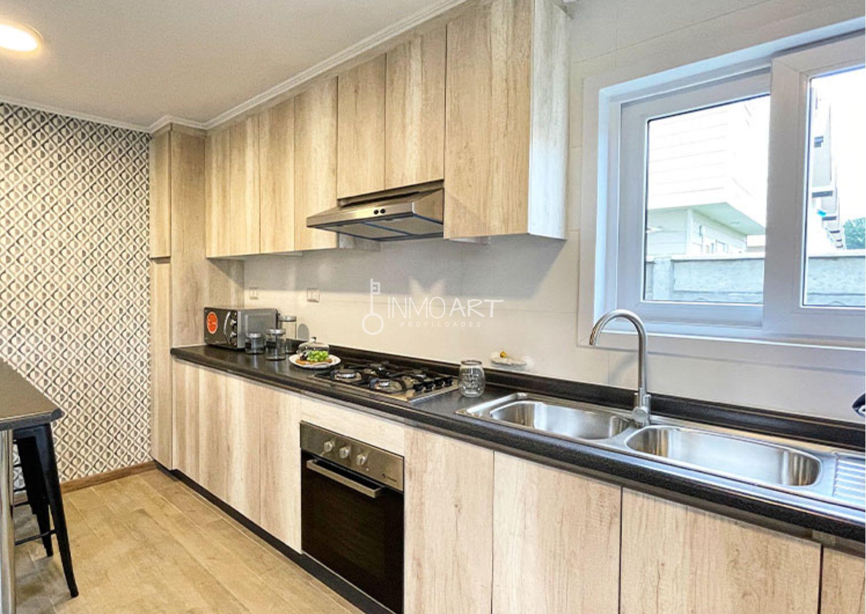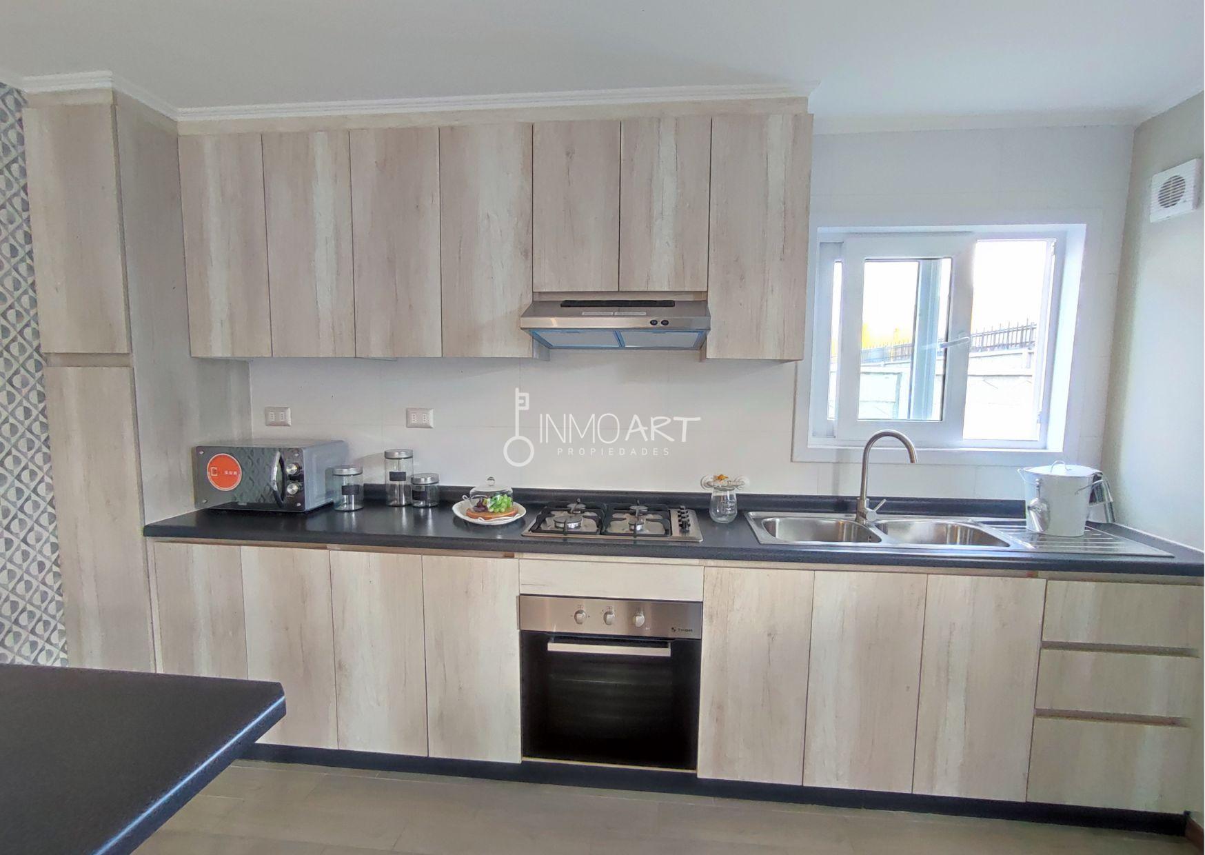 Gran living comedor con cocina amoblada tipo americana, equipada con horno, campana y encimera eléctrica.
